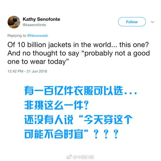 據外媒報道,當地時間週四,美國第一夫人梅拉尼婭在登機前往德克薩斯邊境城市麥卡倫探望移民兒童時,被拍到身着一件寫着“我真的不在乎,你呢(I really don’t care, do u?)”字樣的風衣,引發網友熱議。梅拉尼婭的新聞發言人表示,這只是一件衣服而已,沒有別的意思。就在幾天前,梅拉尼婭通過發言人在《國會山報》發表聲明,就川普政府對非法移民“零容忍”政策首度發聲,公開反對將非法入境兒童與父母分開管制政策。雖然第一夫人在到達麥卡倫時已經脫掉了這件風衣,但仍有網友嘲諷第一夫人內心根本不在乎移民兒童問題。