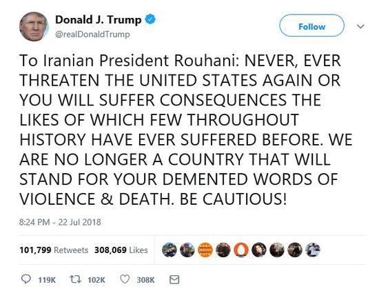 “致伊朗總統魯哈尼:永遠、永遠不要威脅美國,否則你會嚐到歷史上罕見的後果!我們不再是那個會忍受你充滿暴力、死亡言辭的國家了!小心點!”