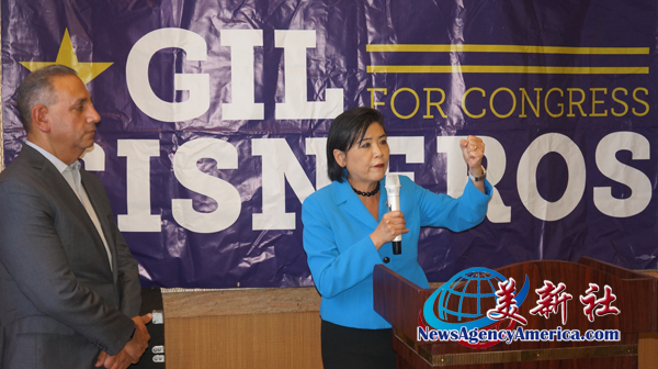 【美新社劉驍宗洛杉磯報導】7月27日,以得票第二名的身份進軍11月加州大選的第39選區國會眾議員候選人喜吉利(Gil Cisneros)在國會眾議員趙美心博士(Dr. Judy Chu)陪同下,走訪華裔匯聚的東區鑽石廣場(Diamond Plaza)。