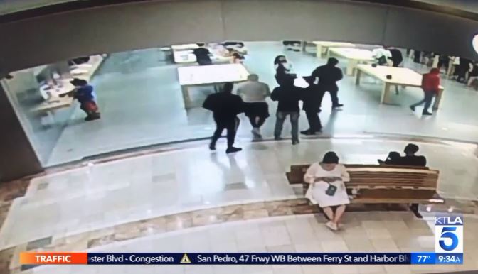 7月7日Fresno 蘋果店也遭遇這樣的“搶了就跑”式打劫(KTLA視頻截屏)
