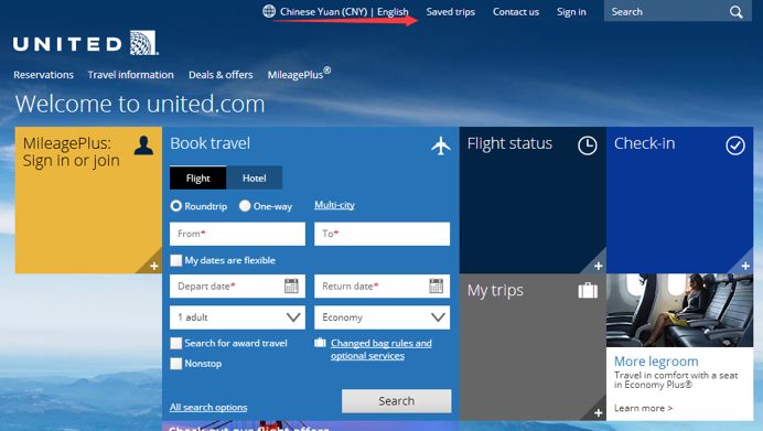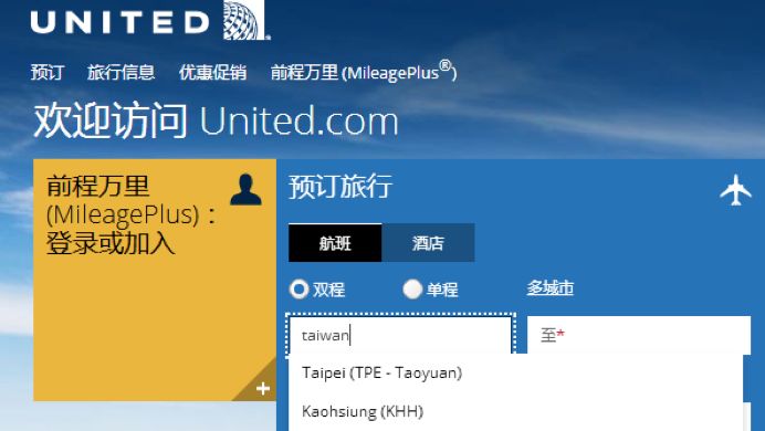 美聯航官網主頁,搜索“taiwan”顯示臺北、高雄等城市。