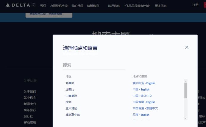 達美航空公司在選擇語言一欄中,只有中國-English、中國-簡體中文、中國香港- English和中國香港-繁體中文。