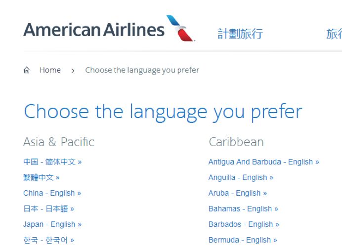 美國航空公司語言欄中,也只有簡體中文、繁體中文及英語標註。