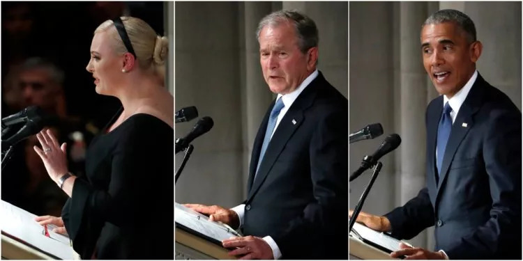前總統奧巴馬和喬治·W·布什今天在麥凱恩參議員葬禮上致辭高度讚揚這位美國英雄。麥凱恩女兒致辭表達對父親的敬仰和懷念。麥肯恩的去世讓人們反省他所秉持的美國精神是否正在被現實的混亂分裂所削弱。而未受到邀請的推手並沒有從儀式上消失,相反,他在字裏行間以被暗示性批評的方式獲得了歷史的存在感。