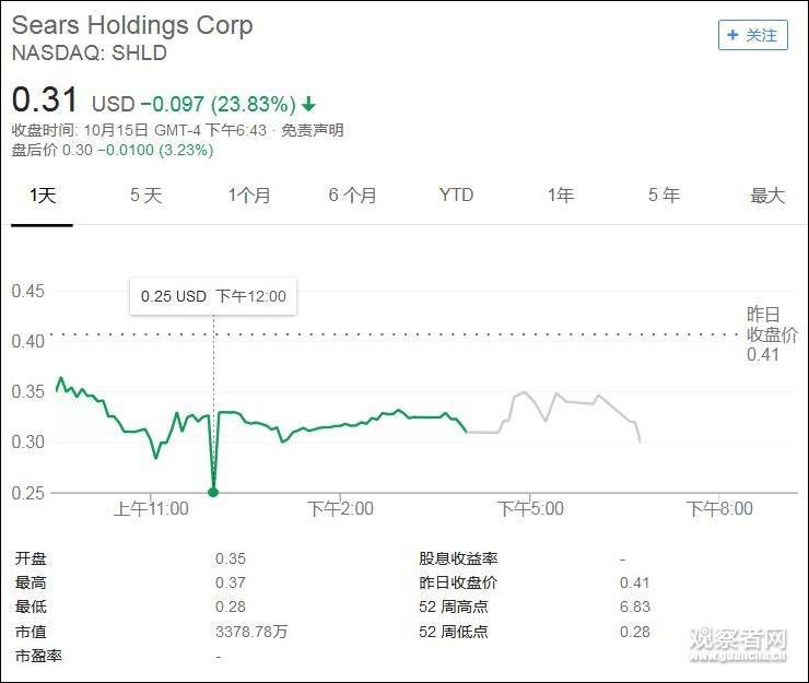 西爾斯百貨自2011年以來累計虧損逾110億美元,年銷售額下降近60%,至167億美元。該公司每年需要籌集超過10億美元的資金才能維持運營。其股價曾在2007年達到每股超過130美元,而昨天一度跌至美股25美分。