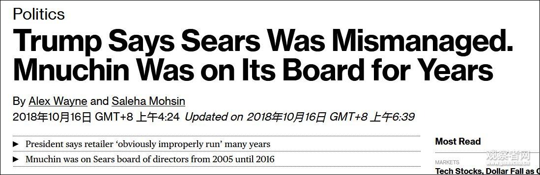 西爾斯申請破產的那一天(15日),彭博社曝料,稱美國現任財務部長努欽(Steven Mnuchin)曾在2005年至2016年間擔任過西爾斯董事。