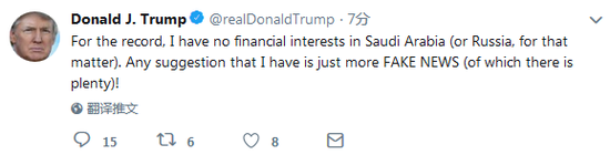 川普發推稱:我在沙特沒有經濟利益,任何說我有經濟利益的都是假新聞。