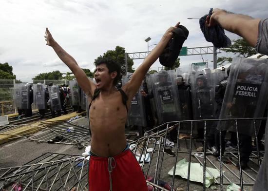 墨西哥最終艱難關閉了邊境大門,警方通過擴音器高呼“請停止進攻!”,但許多移民依然不甘,有的人跳下河企圖遊過墨西哥邊境,有的則坐在橋上等待。