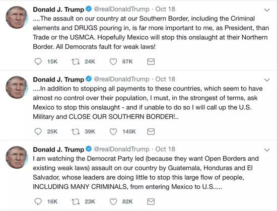 對於墨西哥這個“最後防線”,川普也威脅稱,“我強烈要求墨西哥阻止這波非法移民。若是不能,我將部署軍隊,並關閉南部邊境!”