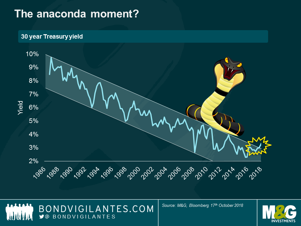 三十年多來,美國30年期國債收益率一直保持在下行區間,也給投資者帶來了長期牛市。但在今年10月初,其收益率卻觸及了四年高點3.446%,這樣的突破是否意味着“巨蟒”已開始蠢蠢欲動了?