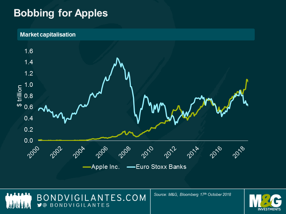舉例來說,歐洲Stoxx銀行指數市值是26家歐洲銀行的總和,其中包括西班牙國家銀行、法國巴黎銀行、法國興業銀和德意志銀行等知名大行。但蘋果的市值不僅遠遠超過歐洲Stoxx銀行指數市值,還超過了土耳其、荷蘭和沙特阿拉伯等國的GDP。