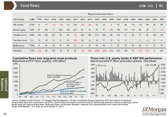 自2007年以來,累計共有2.3萬億美元流入債券型共同基金和ETF中,1.6萬億美元流入股票型共同基金和ETF中,有0.6萬億美元流入多資產共同基金和ETF中。