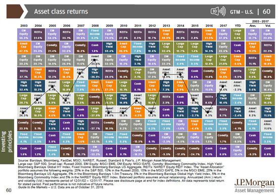 2003年至2017年期間,新興市場股市年均回報率最高(12.7%),同時其年均波動率也最高。美國小盤股和房地產投資信託基金的年均回報率相近(約11%),但是美國小盤股的波動率略低。十五年中,貨幣市場及大宗商品表現最差。