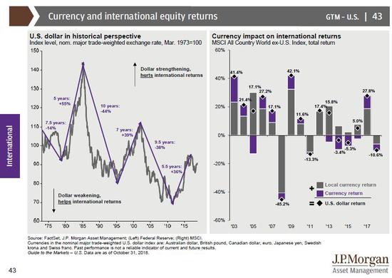 美元升值時,國際股市回報受挫。在過去5年半中,美元累計上漲36%。2017年美元走低,全球除美國外的46國股市在此助益下,美元計價的總回報近28%。不過今年美元走強,這拖累了46國股市美元計價的總回報,下跌幅度超過10%。