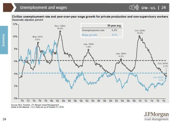 從失業率角度看,美國經濟處於一個非常健康的狀態。目前美國失業率爲3.7%,這個已經處於歷史低位了。過去50年美國平均失業率爲6.2%。從美國經濟三個最重要指標看,經濟增長在加速,失業率不斷下滑,通脹保持在2%以內。可以說美國經濟非常的健康!另外,目前工資收入同比增長3.2%,小幅低於歷史平均的4.1%、