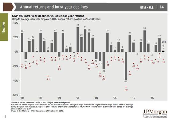 市場的整體波動率在下降,我們看到從上世紀八十年代起,標普500每年最高位和最低位的平均差爲13.8%,而今年該數值爲10%。因此與長期歷史數據比較,今年美股波動不算最劇烈。但是投資者感到今年市場波動提高並沒有錯,因爲去年該數值僅3%。
