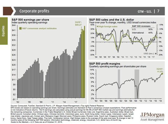 那麼這一輪美股牛市靠什麼推動?從一個表象看,盈利增長還是主要原因。目前預計2018年3季度標普每股收益達到40.27美元,創歷史新高。從收入的來源看,美國本土市場收入佔比超過56%。川普上臺後,美國本土收入佔比在提高。畢竟他的口號是:make America great again!