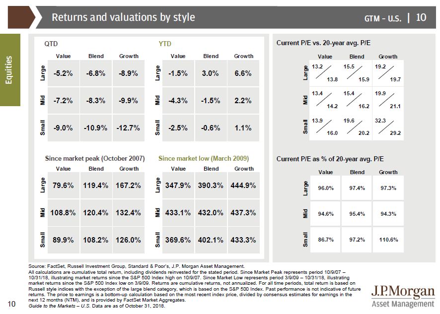 我們再來看看2018年美股風格因子的表現。今年表現最好的因子是大盤成長,年內漲幅6.6%。今年表現最差的是中盤成長,年內跌幅4.3%。2009年3月至今,這一輪美股牛市表現最好的是大盤成長,漲幅444.9%;表現最差是大盤價值,漲幅347.9%。