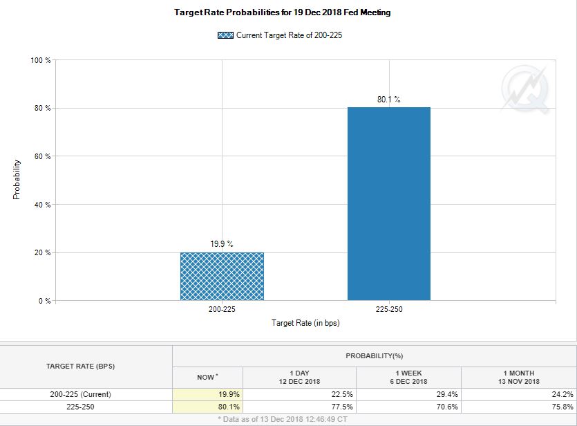 雖然10月以來市場動盪加劇,令一些分析人士開始懷疑美聯儲會改變明年的加息步調,但本週川普的輪番威脅並沒有影響市場短期展望。芝加哥商交所CME根據聯邦基金利率期貨的交易算出,下週加息的概率漲至80%,大於一天前的77.5%、一週前的70.6%和一個月前的75.8%。