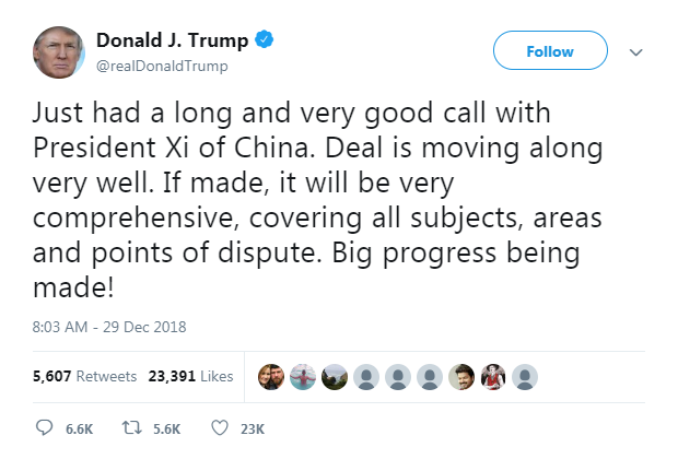 總統川普週六早上發推特稱,他剛剛與中國國家主席習近平通了電話,美中雙方的貿易談判進展的非常順利,正取得重大進展。