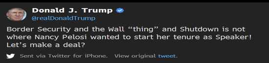 川普的推文稱:“邊境安全,隔離牆,政府停擺,這三件事難道不是南希·佩洛西出任議長後想最先處理的問題嗎!我們達成協議如何?”