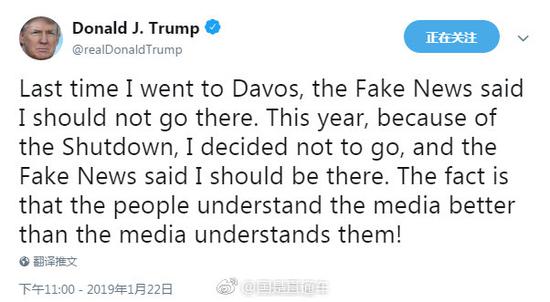 【缺席達沃斯被指責,川普在推特上申冤】當地時間22日,世界經濟論壇在瑞士小鎮達沃斯開幕。由於美國政府部分關門,川普取消了參加達沃斯論壇的計劃。有美媒稱,川普缺席達沃斯讓美國與世界脫節。川普在推特上稱:“上次我去達沃斯,假新聞說我不應該去那裏。今年,因爲政府停擺,我決定不去,假新聞說我應該去。事實是,人們比媒體更瞭解他們!”(孫秋霞)#國是論壇#