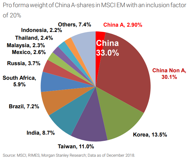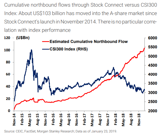 不過摩根士丹利在報告中預計,2019年將有600億到1000億美元的資金通過QFII和互聯互通機制主動流入A股市場。其中,資產管理公司爲適應納入因子的變化而調整其A股配置,以MSCI EM爲基準的現有全球AUM就可能帶來250億美元的資金流入規模。