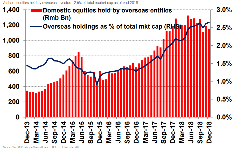 從其迄今爲止的外資A股持股增長趨勢來看,雖然在2018年,外資持有的A股從2.1%增加至2.6%,增幅僅爲0.5%。但在未來10年,這一比例或將達到10%。