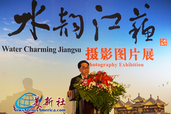 美国江苏总商会会长蔡成华致詞時首先代表美国江苏总商会,热烈欢迎江苏省海外联谊会杨岳会长率领的访问团莅临洛杉矶推介江苏並同時舉辦“水韵江苏摄影图片展”。感谢访问团给南加州各界带来了丰富、精美的摄影作品,通过精美的圖片展示让更多的人了解江苏。