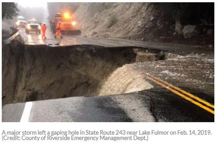 受災最嚴重的地區之一是河濱縣243號公路,大雨侵蝕土壤後,公路下方形成了一個大洞。大雨傾盆而下,這個洞變成了一條湍急的瀑布。據Caltrans的新聞發佈,10號高速公路和Idyllwild市之間的高速公路將關閉至少兩個月。