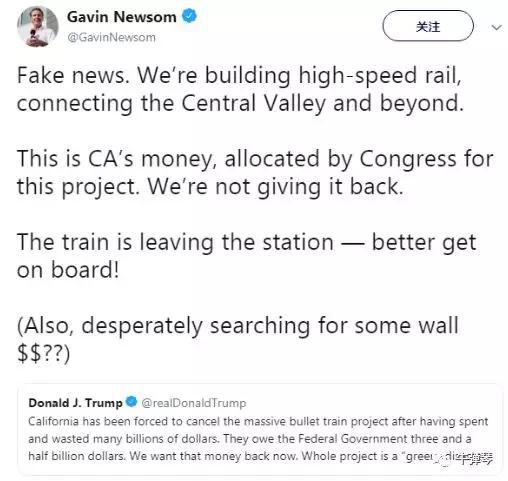加州州長加文-紐森(Gavin Newsom)針對川普的推特迴應稱:“假新聞!我們仍在建設高鐵,連接該州中央谷地和其他地方。這是加州的錢,是國會撥給這個項目的,我們是不會還錢的。火車已經駛出站臺——最好趕緊上車。(還有,仍舊在歇斯底里地尋找建牆資金嗎)”