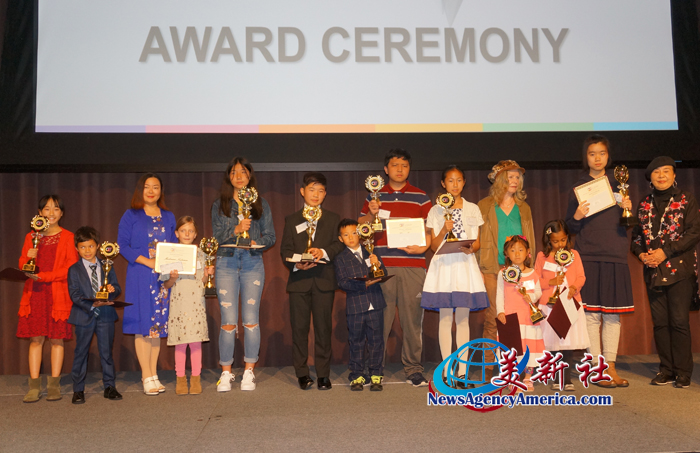 全美浙江总商会林光会长、张鸣执行会长(后排右二),协办方美国华人专家会王希萌会长(后排左三)、美国华人社团大联盟代表潘松林(后排右四)、美国联合总商会代表胡美美(后排左二)、洛杉矶阳光学院副院长郑重(后排左一)向银奖选手颁发了奖状和奖金。