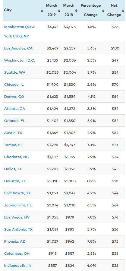 3月,在統計的美國253座城市中,92%的城市平均租金有所增加,只有2%的城市顯示爲下降。
