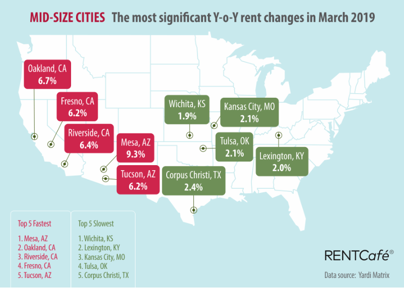 美國中型城市方面,3月平均租金漲幅仍然是西海岸更佔優。加州有三個城市上榜,按同比漲幅從大到小排名分別是Oakland、Riverside、Fresno。漲幅最大的中型城市爲亞利桑那州的Tucson。
