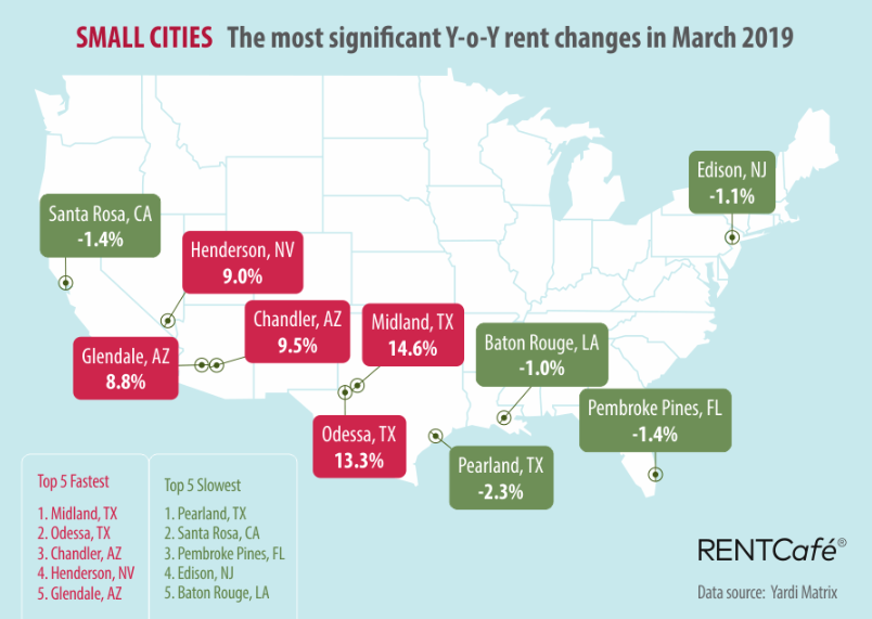 美國小城市方面,3月平均租金漲跌幅尤其明顯。德州城市Midland3月平均租金同比漲幅高達14.6%,漲幅雄居美國所有小城市的首位;而同在德州的Pearland則以-2.3%的成績位列跌幅第一。