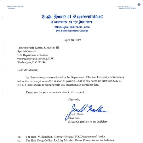 納德勒在信中寫道,“我要求你儘快向司法委員會作證,但無論如何,最遲不得晚於2019年5月23日”。