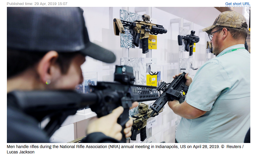 (4月28日,美國印第安納波利斯舉行的全國步槍協會年會上,一名男子手持步槍圖片來源:RT報道截圖)