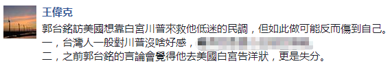 但對於郭臺銘赴美與川普會面,有島內網友認爲,如果郭赴美是想靠白宮來拯救民調,那此舉可能會傷到自己↓