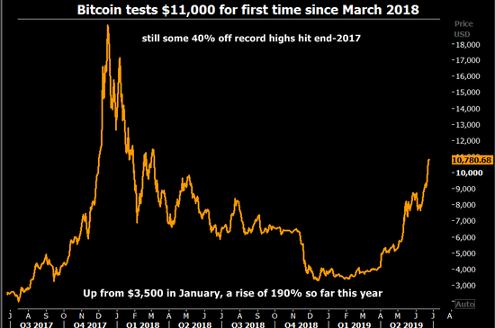 比特幣週一從15個月高位回落,週末曾跳漲逾10%,有分析師指出,這波大漲是因爲在Facebook推出數字貨幣Libra之後市場對加密貨幣的被接受程度愈發樂觀。