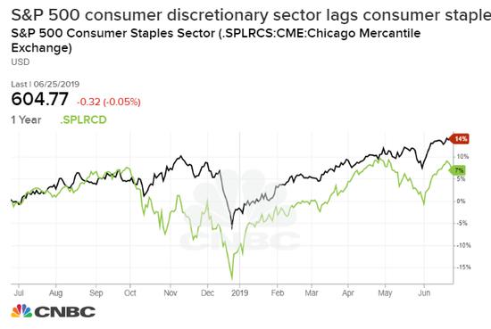 自去年10月以來,標普500非必需消費品板塊的表現一直落後於標普500必需消費品板塊。分析師表示,如果希望牛市持續下去,週期股必須在漲勢中佔據領先地位。