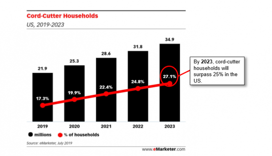 今年,大約19%的家庭選擇成爲“剪線族”。他們尋找像Netflix、Hulu和亞馬遜 Prime這樣的替代產品,其提供大量的內容,這可能是有線電視用戶下降的一個重要原因。