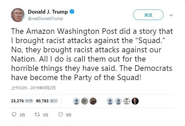 川普在推特上寫道,“亞馬遜華盛頓郵報做了一篇報道,稱我對‘小分隊’進行了種族主義攻擊。不,是她們對我們的國家進行了種族主義攻擊。”他補充說,“我所做的一切就是讓她們爲她們所說的可怕的話而大聲疾呼。民主黨人已經成爲了‘小分隊’的一員!”