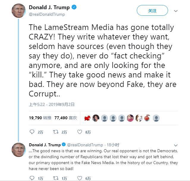 川普在隨後的兩條推文中繼續攻擊媒體。他在推特上寫道,“跛腳媒體(LameStream Media)完全瘋了!他們想寫什麼就寫什麼,很少有消息來源(即使他們說他們有),再也不做‘事實覈查’,只是在尋找‘殺戮’。”但他並沒有舉例。