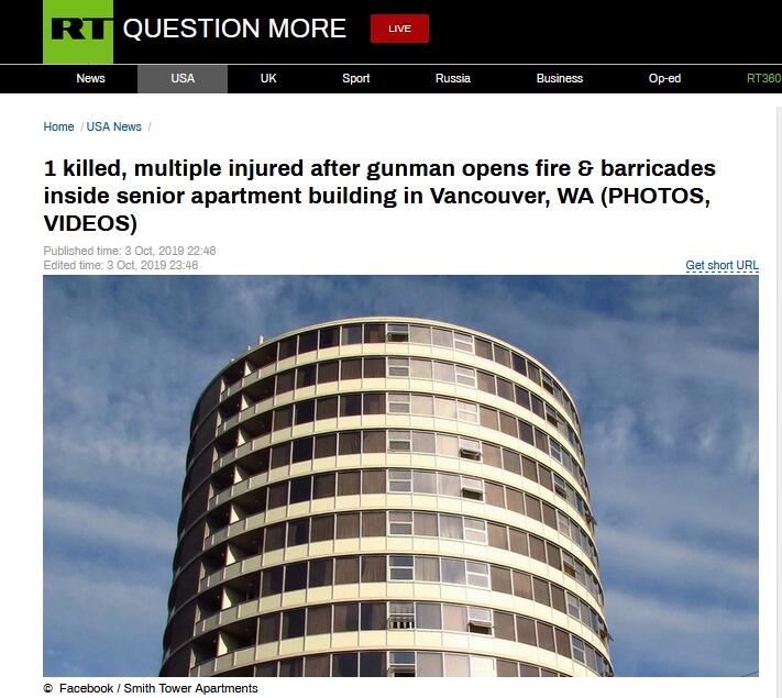 【環球網報道 記者 李東堯】當地時間10月3日,美國華盛頓州西南部城市溫哥華一高級公寓發生槍擊案。“今日俄羅斯”(RT)最新報道說,一名槍手在當地一處老年公寓樓內開槍,打死1人,打傷2人。