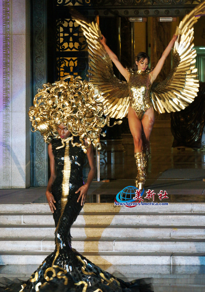 開場秀中,氣場逼人的“美杜莎”登場,緊跟其後的是本屆大都會時尚週的主題封面人物:金翼女神。