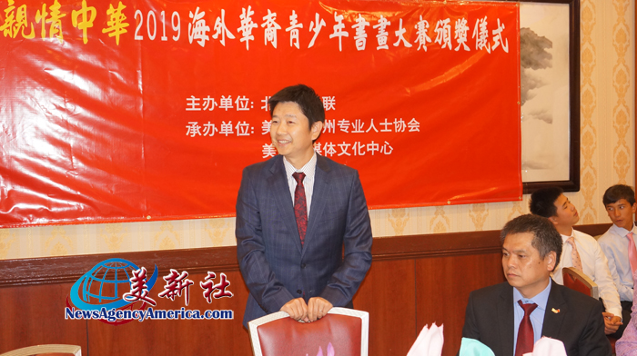 中华人民共和国驻洛杉矶总领馆领侨处汤长安主任在致词中表示:北京市侨联所举办的“亲情中华-海外华裔青少年书画比赛”已经举办了14年七届,洛杉矶的同学们虽然在今年首次参加,但是在北京的最后总决赛中取得一金,一银,两铜和一优秀奖的好成绩,在这里恭喜各位同学和家长、老师们。你们生活在海外,继续传承和热爱祖国的书画艺术和中华文化的精神及毅力值得表扬和鼓励。我们也非常感谢所有出钱出力推动这一活动的义工团队朋友们,大家都为中华文化的海外传承和发展做出了积极的努力和贡献!恭喜洛杉矶的承办者被任命优秀组织单位!