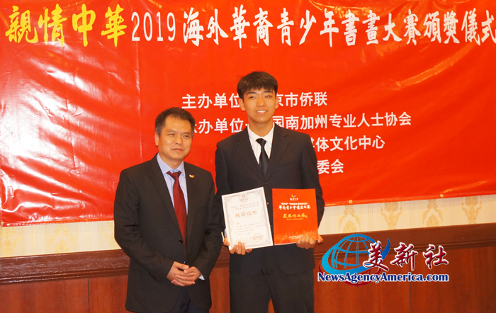 当晚的颁奖仪式上,由洛杉矶组委会成员陈劲松律师为获得优秀奖的15岁王言鑫同学颁发获奖证书。