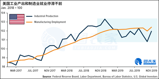 儘管2017年1月對太陽能電池板和洗碗機徵收了第一波關稅,但在2017年和2018年的大部分時間裏,工業生產和製造業都在以健康的速度增長。不過,自2018年底以來,美國製造業陷入了停滯,美國對其貿易伙伴徵收的關稅和報復性關稅阻礙了經濟增長。