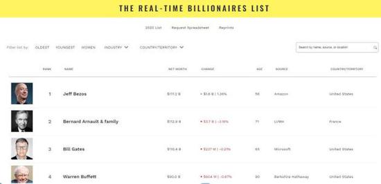 《福布斯》網站最新世界富豪排行榜。(圖片截自《福布斯》雜誌網站)