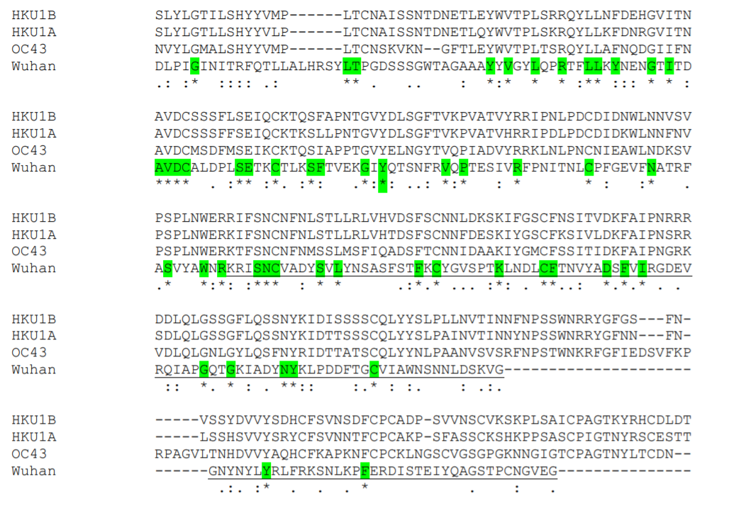 常见的冠状病毒HKU1A,HKU1B,OC43和2019-nCoV的S蛋白比对(局部图),绿色代表相同的氨基酸,下横线代表新冠病毒的受体结合域(RBD)